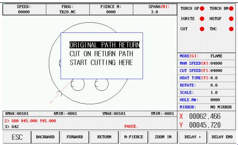Trong quá trình quay lại, gặp hệ thống G00 bị đình chỉ (đạt điểm xuyên thủng), người vận hành có thể chọn là tiếp tục quay lại,